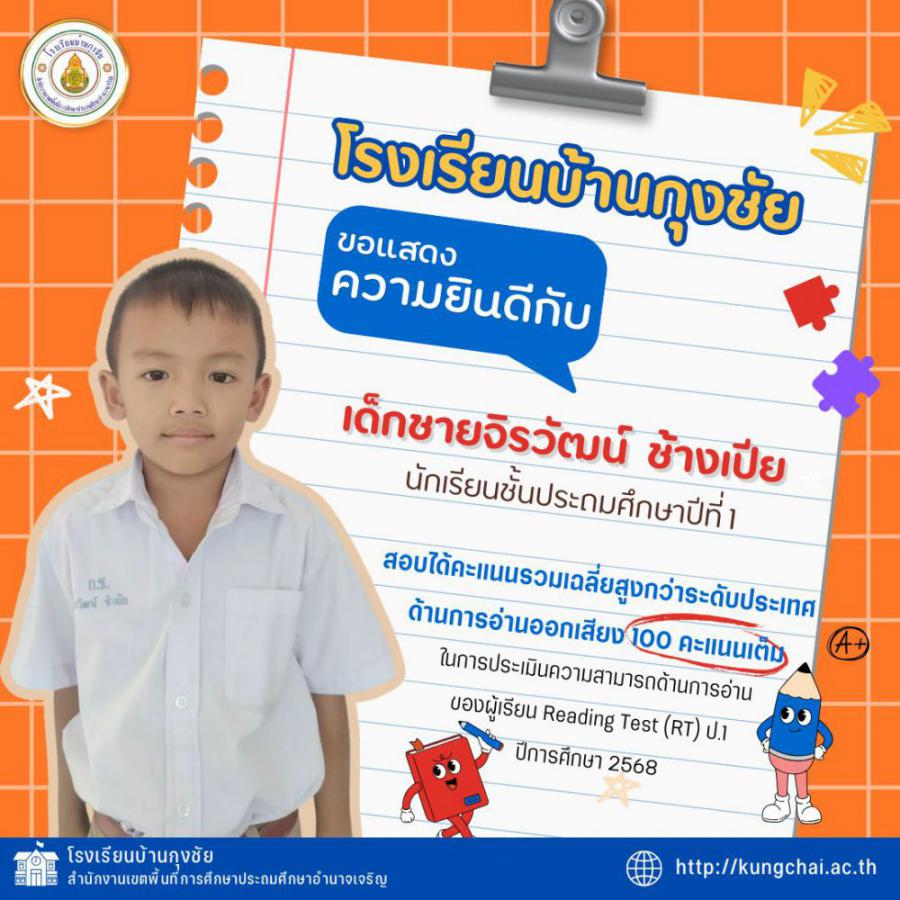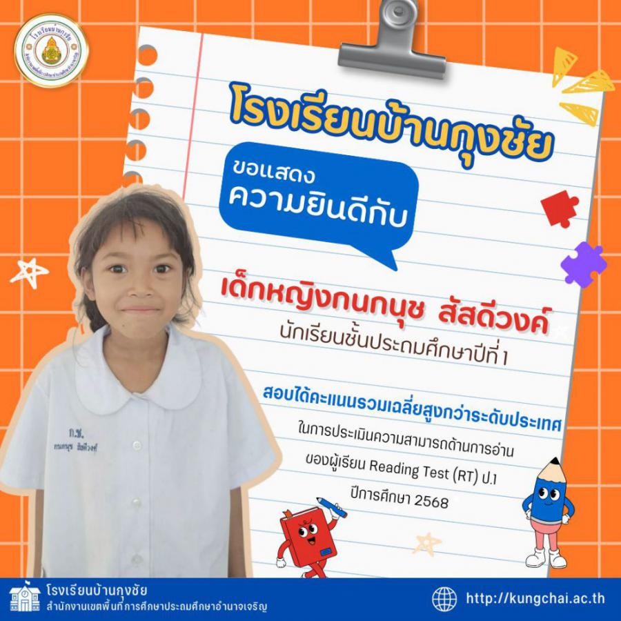 โรงเรียนบ้านกุงชัย ขอแสดงความยินดีกับนักเรียนชั้นประถมศึกษาปีที่ 1 ที่มีผลการทดสอบเพื่อประเมินความสามารถด้านการอ่าน (RT) ประจำปีการศึกษา 2568 อยู่ในระดับที่น่าภาคภูมิใจ การประเมิน RT ประกอบด้วย 2 ด้าน ได้แก่ การอ่านออกเสียง และการอ่านรู้เรื่อง โดยภาพรวมทั้ง 2 ด้าน นักเรียนหลายคนมีผลคะแนนสูงกว่าระดับประเทศ ความสำเร็จในครั้งนี้เกิดจากความตั้งใจของนักเรียน การจัดการเรียนรู้ของคณะครู และความร่วมมือจากผู้ปกครองทุกท่าน โรงเรียนมุ่งมั่นพัฒนาทักษะการอ่านทั้งด้านการอ่านออกเสียงและการอ่านรู้เรื่องอย่างต่อเนื่อง เพื่อยกระดับคุณภาพการศึกษาให้ดียิ่งขึ้น S:0