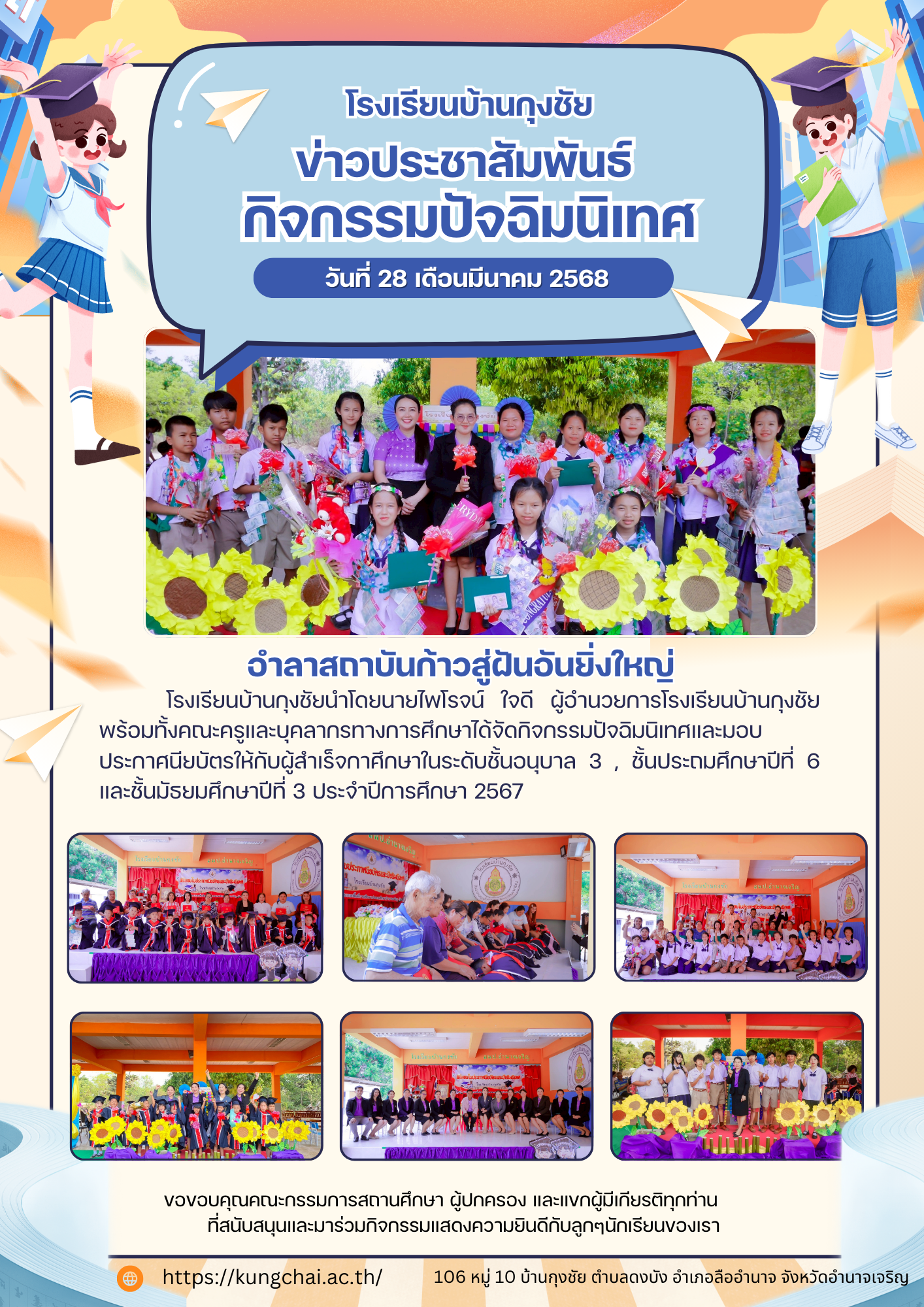 โรงเรียนบ้านกุงชัยนำโดยนายไพโรจน์ ใจดี ผู้อำนวยการโรงเรียนบ้านกุงชัย พร้อมทั้งคณะครูและบุคลากรทางการศึกษาได้จัดกิจกรรมปัจฉิมนิเทศและมอบประกาศนียบัตรให้กับผู้สำเร็จกาศึกษาในระดับชั้นอนุบาล 3 , ชั้นประถมศึกษาปีที่ 6 และชั้นมัธยมศึกษาปีที่ 3 ประจำปีการศึกษา 2567