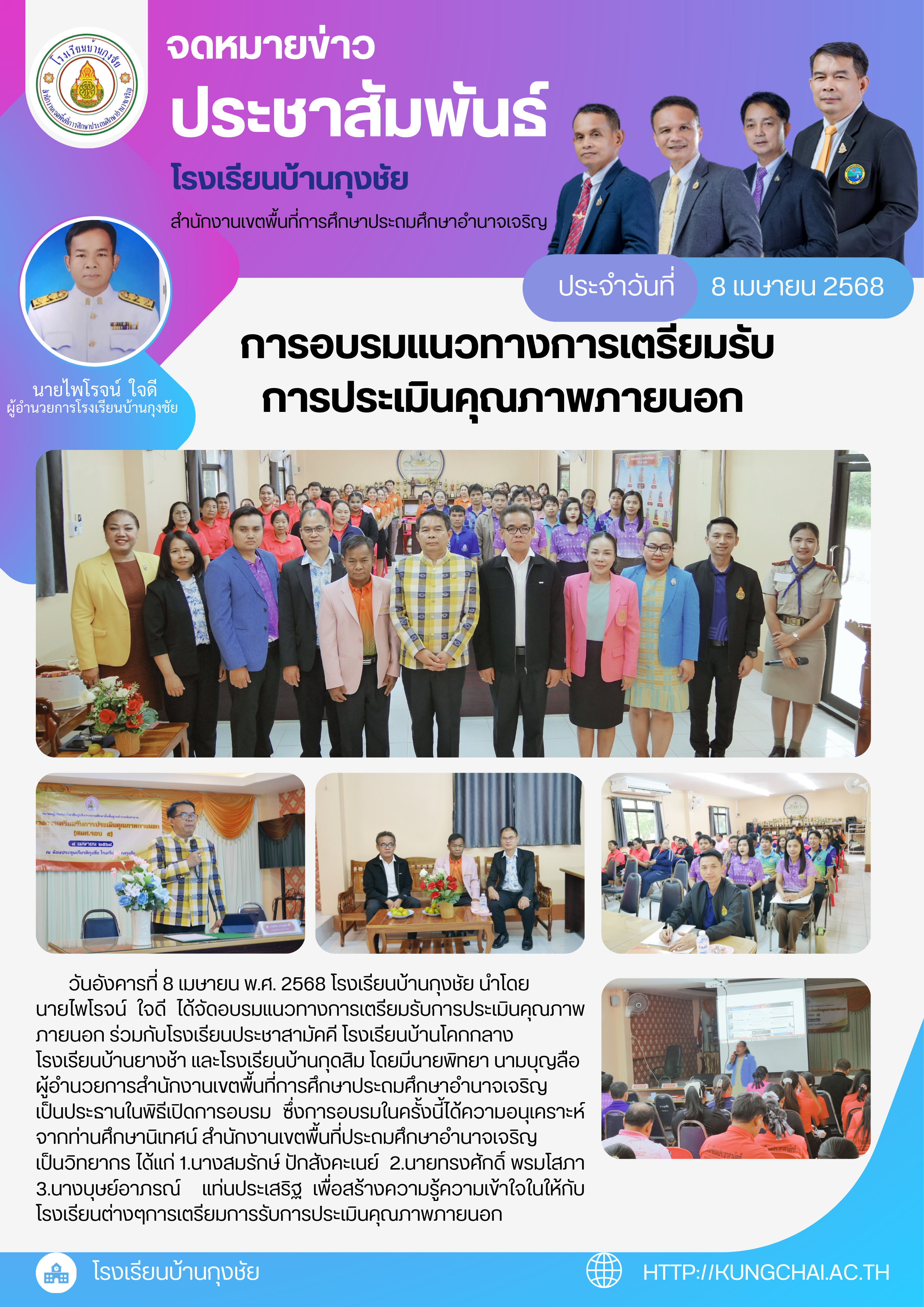 โรงเรียนบ้านกุงชัย นำโดย นายไพโรจน์ ใจดี ได้จัด “อบรมแนวทางการเตรียมรับการประเมินคุณภาพภายนอก” ร่วมกับโรงเรียนประชาสามัคคี โรงเรียนบ้านโคกกลาง โรงเรียนบ้านยางช้า และโรงเรียนบ้านกุดสิม โดยมีนายพิทยา นามบุญลือ ผู้อำนวยการสำนักงานเขตพื้นที่การศึกษาประถมศึกษาอำนาจเจริญ เป็นประธานในพิธีเปิดการอบรม ซึ่งการอบรมในครั้งนี้ได้ความอนุเคราะห์จากท่านศึกษานิเทศน์ สำนักงานเขตพื้นที่ประถมศึกษาอำนาจเจริญ เป็นวิทยากร ได้แก่