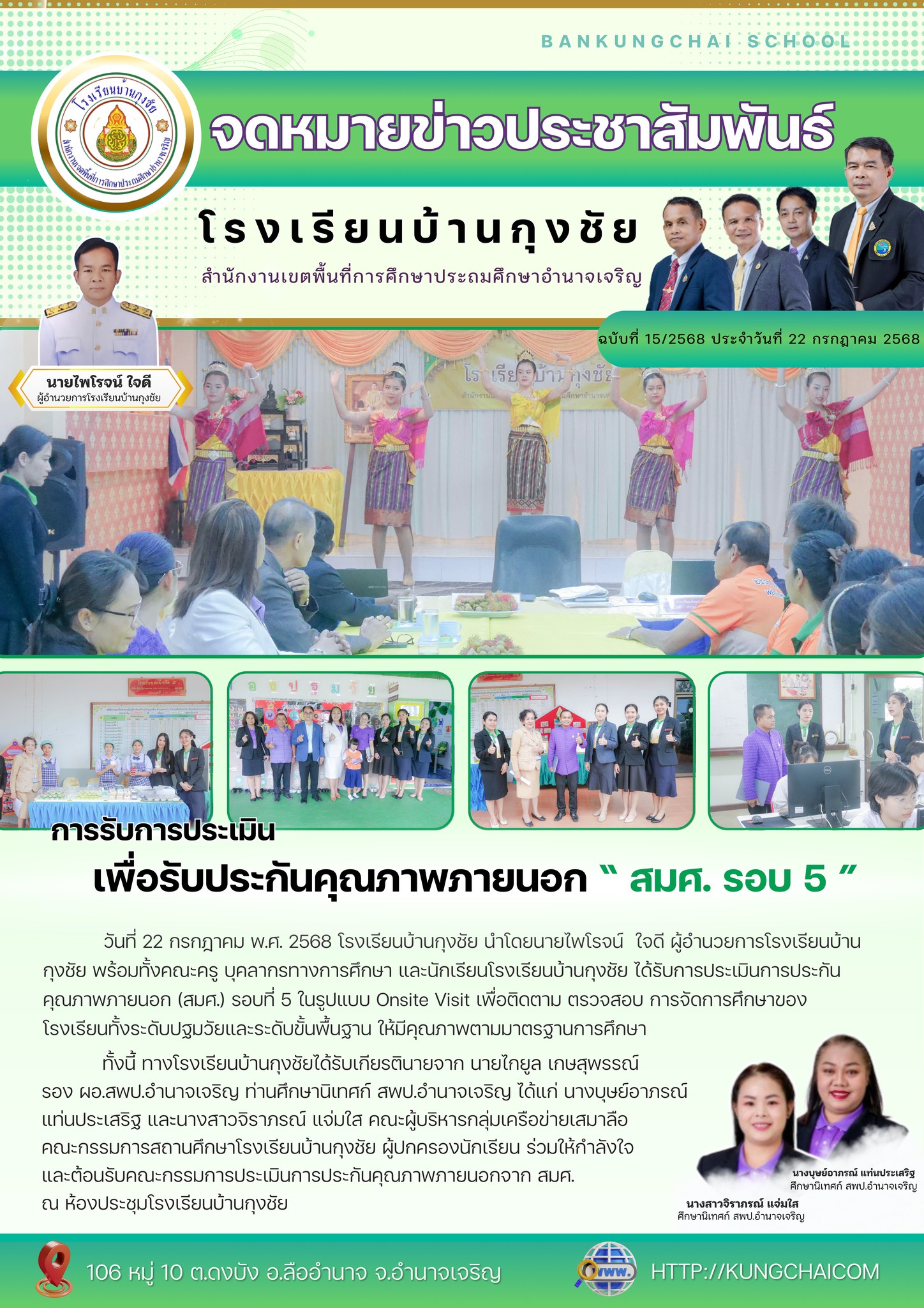 กุงชัย พร้อมทั้งคณะครู บุคลากรทางการศึกษา และนักเรียนโรงเรียนบ้านกุงชัย ได้รับการประเมินการประกันคุณภาพภายนอก (สมศ.) รอบที่ 5 ในรูปแบบ Onsite Visit เพื่อติดตาม ตรวจสอบ การจัดการศึกษาของโรงเรียนทั้งระดับปฐมวัยและระดับขั้นพื้นฐาน ให้มีคุณภาพตามมาตรฐานการศึกษา