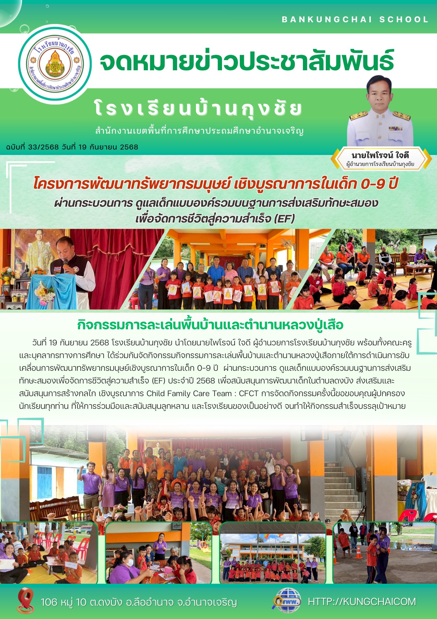 โรงเรียนบ้านกุงชัยนำโดยนายไพโรจน์ ใจดี ผู้อำนวยการโรงเรียนบ้านกุงชัย พร้อมทั้งคณะครูและบุคลากรทางการศึกษา ได้ร่วมกันจัดกิจกรรมกิจกรรมการละเล่นพื้นบ้านและตำนานหลวงปู่เสือภายใต้การดำเนินการขับเคลื่อนการพัฒนาทรัพยากรมนุษย์เชิงบูรณาการในเด็ก 0-9 ปี ผ่านกระบวนการ ดูแลเด็กแบบองค์รวมบนฐานการส่งเสริมทักษะสมองเพื่อจัดการชีวิตสู่ความสำเร็จ (EF) ประจำปี 2568 เพื่อสนับสนุนการพัฒนาเด็กในตำบลดงบัง ส่งเสริมและสนับสนุนการสร้างกลไก เชิงบูรณาการ Child Family Care Team : CFCT การจัดดกิจกรรมครั้งนี้ขอขอบคุณผู้ปกครองนักเรียนทุกท่าน ที่ให้การร่วมมือและสนับสนุนลูกหลาน และโรงเรียนของเป็นอย่างดี จนทำให้กิจกรรมสำเร็จบรรลุเป้าหมาย