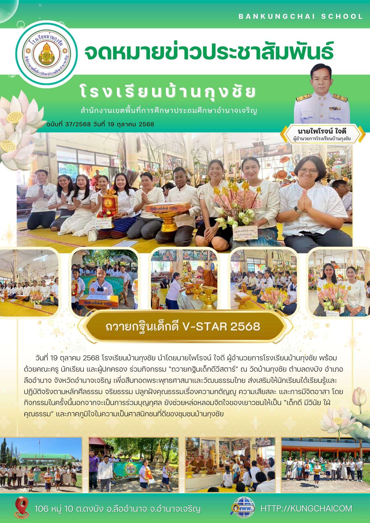 วันที่ 19 ตุลาคม 2568 โรงเรียนบ้านกุงชัย นำโดยนายไพโรจน์ ใจดี ผู้อำนวยการโรงเรียนบ้านกุงชัย พร้อมด้วยคณะครู นักเรียน และผู้ปกครอง ร่วมกิจกรรม “ถวายกฐินเด็กดีวีสตาร์” ณ วัดบ้านกุงชัย ตำบลดงบัง อำเภอลืออำนาจ จังหวัดอำนาจเจริญ เพื่อสืบทอดพระพุทธศาสนาและวัฒนธรรมไทย ส่งเสริมให้นักเรียนได้เรียนรู้และปฏิบัติจริงตามหลักศีลธรรม จริยธรรม ปลูกฝังคุณธรรมเรื่องความกตัญญู ความเสียสละ และการมีจิตอาสา โดยกิจกรรมในครั้งนี้นอกจากจะเป็นการร่วมบุญกุศล ยังช่วยหล่อหลอมจิตใจของเยาวชนให้เป็น “เด็กดี มีวินัย ใฝ่คุณธรรม” และภาคภูมิใจในความเป็นศาสนิกชนที่ดีของชุมชนบ้านกุงชัย