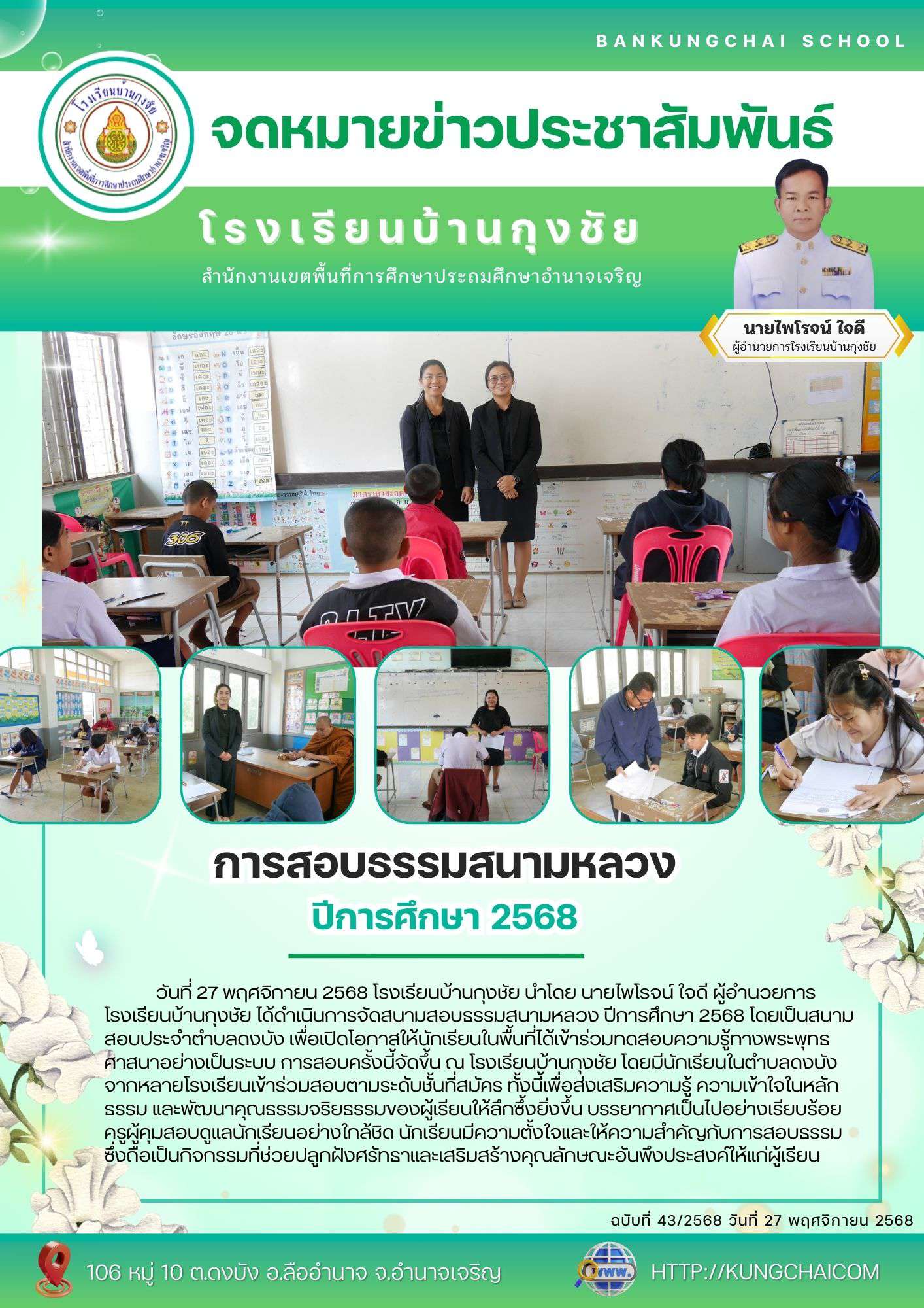 วันที่ 27 พฤศจิกายน 2568 โรงเรียนบ้านกุงชัย นำโดย นายไพโรจน์ ใจดี ผู้อำนวยการโรงเรียนบ้านกุงชัย ได้ดำเนินการจัดสนามสอบธรรมสนามหลวง ปีการศึกษา 2568 โดยเป็นสนามสอบประจำตำบลดงบัง เพื่อเปิดโอกาสให้นักเรียนในพื้นที่ได้เข้าร่วมทดสอบความรู้ทางพระพุทธศาสนาอย่างเป็นระบบ การสอบครั้งนี้จัดขึ้น ณ โรงเรียนบ้านกุงชัย โดยมีนักเรียนในตำบลดงบังจากหลายโรงเรียนเข้าร่วมสอบตามระดับชั้นที่สมัคร ทั้งนี้เพื่อส่งเสริมความรู้ ความเข้าใจในหลักธรรม และพัฒนาคุณธรรมจริยธรรมของผู้เรียนให้ลึกซึ้งยิ่งขึ้น บรรยากาศเป็นไปอย่างเรียบร้อย ครูผู้คุมสอบดูแลนักเรียนอย่างใกล้ชิด นักเรียนมีความตั้งใจและให้ความสำคัญกับการสอบธรรม ซึ่งถือเป็นกิจกรรมที่ช่วยปลูกฝังศรัทธาและเสริมสร้างคุณลักษณะอันพึงประสงค์ให้แก่ผู้เรียน