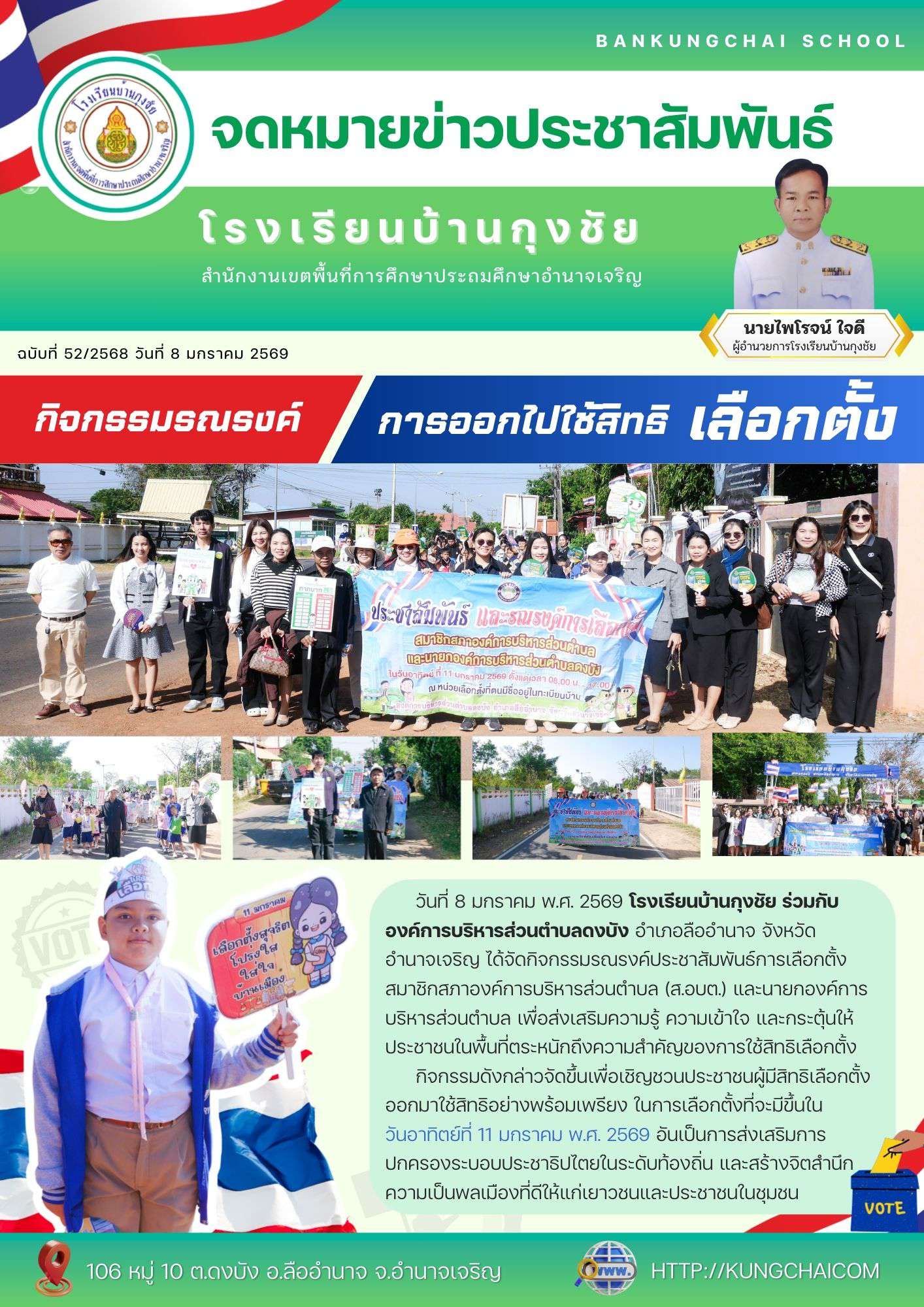 วันที่ 8 มกราคม พ.ศ. 2569 โรงเรียนบ้านกุงชัย ร่วมกับองค์การบริหารส่วนตำบลดงบัง อำเภอลืออำนาจ จังหวัดอำนาจเจริญ ได้จัดกิจกรรมรณรงค์ประชาสัมพันธ์การเลือกตั้งสมาชิกสภาองค์การบริหารส่วนตำบล (ส.อบต.) และนายกองค์การบริหารส่วนตำบล เพื่อส่งเสริมความรู้ ความเข้าใจ และกระตุ้นให้ประชาชนในพื้นที่ตระหนักถึงความสำคัญของการใช้สิทธิเลือกตั้งกิจกรรมดังกล่าวจัดขึ้นเพื่อเชิญชวนประชาชนผู้มีสิทธิเลือกตั้งออกมาใช้สิทธิอย่างพร้อมเพรียง ในการเลือกตั้งที่จะมีขึ้นใน วันอาทิตย์ที่ 11 มกราคม พ.ศ. 2569 อันเป็นการส่งเสริมการปกครองระบอบประชาธิปไตยในระดับท้องถิ่น และสร้างจิตสำนึกความเป็นพลเมืองที่ดีให้แก่เยาวชนและประชาชนในชุมชน