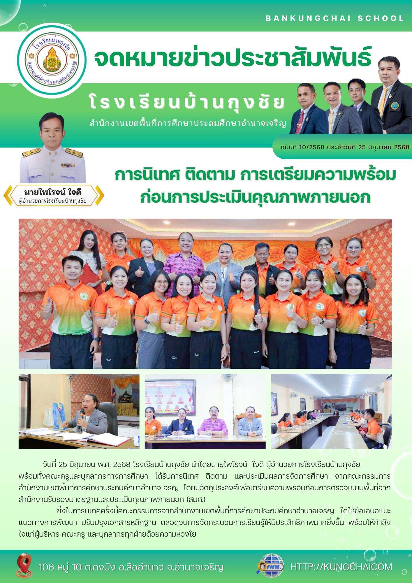 วันที่ 25 มิถุนายน พ.ศ. 2568 โรงเรียนบ้านกุงชัย นำโดยนายไพโรจน์ ใจดี ผู้อำนวยการโรงเรียนบ้านกุงชัย พร้อมทั้งคณะครูและบุคลากรทางการศึกษา ได้รับการนิเทศ ติดตาม และประเมินผลการจัดการศึกษา จากคณะกรรมการสำนักงานเขตพื้นที่การศึกษาประถมศึกษาอำนาจเจริญ โดยมีวัตถุประสงค์เพื่อเตรียมความพร้อมก่อนการตรวจเยี่ยมพื้นที่จากสำนักงานรับรองมาตรฐานและประเมินคุณภาพภายนอก (สมศ.)