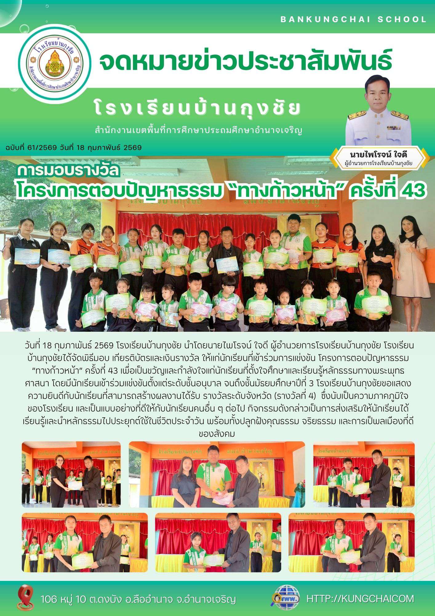 วันที่ 18 กุมภาพันธ์ 2569 โรงเรียนบ้านกุงชัย นำโดยนายไพโรจน์ ใจดี ผู้อำนวยการโรงเรียนบ้านกุงชัย โรงเรียนบ้านกุงชัยได้จัดพิธีมอบ เกียรติบัตรและเงินรางวัล ให้แก่นักเรียนที่เข้าร่วมการแข่งขัน โครงการตอบปัญหาธรรม “ทางก้าวหน้า” ครั้งที่ 43 เพื่อเป็นขวัญและกำลังใจแก่นักเรียนที่ตั้งใจศึกษาและเรียนรู้หลักธรรมทางพระพุทธศาสนา โดยมีนักเรียนเข้าร่วมแข่งขันตั้งแต่ระดับชั้นอนุบาล จนถึงชั้นมัธยมศึกษาปีที่ 3 โรงเรียนบ้านกุงชัยขอแสดงความยินดีกับนักเรียนที่สามารถสร้างผลงานได้รับ รางวัลระดับจังหวัด (รางวัลที่ 4) ซึ่งนับเป็นความภาคภูมิใจของโรงเรียน และเป็นแบบอย่างที่ดีให้กับนักเรียนคนอื่น ๆ ต่อไป กิจกรรมดังกล่าวเป็นการส่งเสริมให้นักเรียนได้เรียนรู้และนำหลักธรรมไปประยุกต์ใช้ในชีวิตประจำวัน พร้อมทั้งปลูกฝังคุณธรรม จริยธรรม และการเป็พลเมืองที่ดีของสังคม