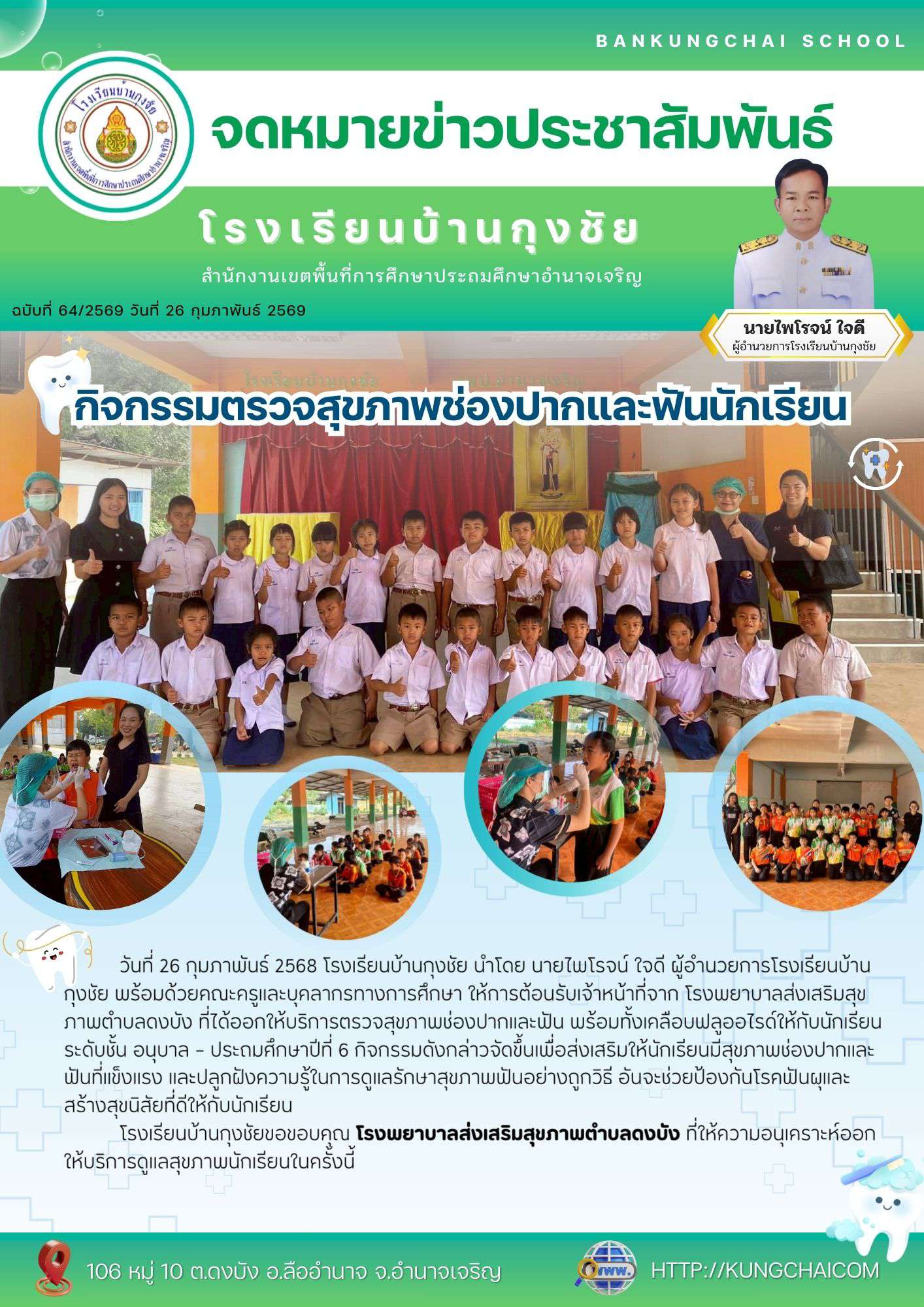 กุงชัย พร้อมด้วยคณะครูและบุคลากรทางการศึกษา ให้การต้อนรับเจ้าหน้าที่จาก โรงพยาบาลส่งเสริมสุขภาพตำบลดงบัง ที่ได้ออกให้บริการตรวจสุขภาพช่องปากและฟัน พร้อมทั้งเคลือบฟลูออไรด์ให้กับนักเรียนระดับชั้น อนุบาล – ประถมศึกษาปีที่ 6 กิจกรรมดังกล่าวจัดขึ้นเพื่อส่งเสริมให้นักเรียนมีสุขภาพช่องปากและฟันที่แข็งแรง และปลูกฝังความรู้ในการดูแลรักษาสุขภาพฟันอย่างถูกวิธี อันจะช่วยป้องกันโรคฟันผุและสร้างสุขนิสัยที่ดีให้กับนักเรียน