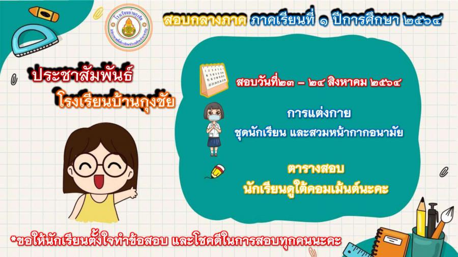 ด้วยโรงเรียนบ้านกุงชัย ได้จัดกิจกรรมการเรียนการสอนภาคเรียนที่ 1 ปีการศึกษา 2564 ตั้งแต่วันที่ 1 มิถุนายน 2564 และการวัดผลประเมินกลางภาคเรียนที่ 1 ในวันที่ 4-6 สิงหาคม 2564 แต่เนื่องจากการแพร่ระบาดของโรคโคโรนาไวรัส (โควิด 19) ทำให้โรงเรียนจึงเลื่อนสอบวัดผลกลางภาคเรียนที่ 1 ปีการศึกษา 2564 เป็นวันที่ 23-24 สิงหาคม 2564