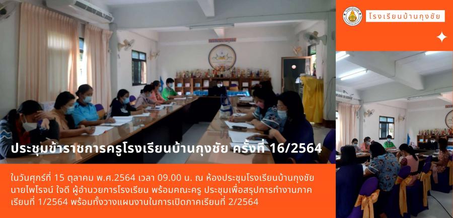 ในวันศุกร์ที่ 15 ตุลาคม พ.ศ.2564 เวลา 09.00 น. ณ ห้องประชุมโรงเรียนบ้านกุงชัย นายไพโรจน์ ใจดี ผู้อำนวยการโรงเรียน พร้อมคณะครู ประชุมเพื่อสรุปการทำงานภาคเรียนที่ 1/2564 พร้อมทั้งวางแผนงานในการเปิดภาคเรียนที่ 2/2564