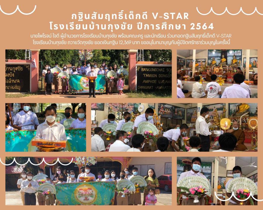 นายไพโรจน์ ใจดี ผู้อำนวยการโรงเรียนบ้านกุงชัย พร้อมคณะครู และนักเรียน ร่วมทอดกฐินสัมฤทธิ์เด็กดี V-STAR โรงเรียนบ้านกุงชัย ถวายวัดกุงชัย ยอดเงินกฐิน 12,369 บาท ขออนุโมทนาบุญกับผู้มีจิตศรัทธาร่วมบุญในครั้งนี้