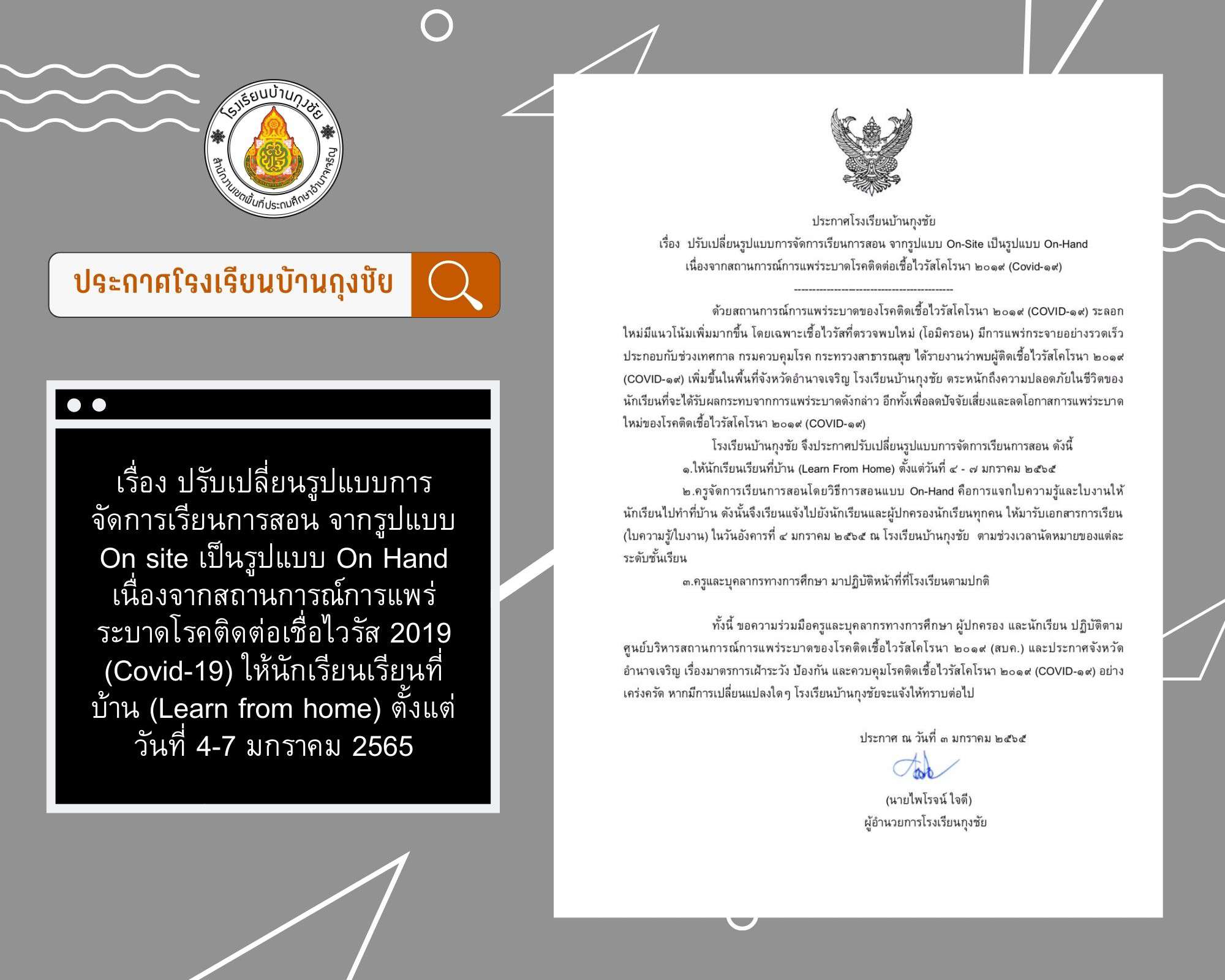 เรื่อง ปรับเปลี่ยนรูปแบบการจัดการเรียนการสอน จากรูปแบบ On site เป็นรูปแบบ On Hand เนื่องจากสถานการณ์การแพร่ระบาดโรคติดต่อเชื่อไวรัส 2019 (Covid-19) ให้นักเรียนเรียนที่บ้าน (Learn from home) ตั้งแต่วันที่ 4-7 มกราคม 2565