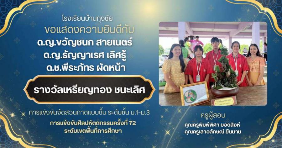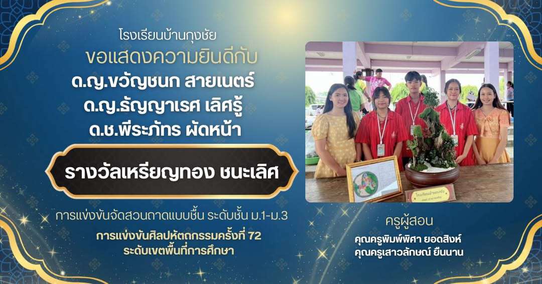 ขอแสดงความยินดี กับเด็กหญิงขวัญชนก สายเนตร์ เด็กหญิงธัญญาเรศ เลิศรู้ และเด็กชายพีระภัทร ผัดหน้า ได้รับรางวัลเหรียญทองชนะเลิศ การแข่งขันจัดสวนถาดแบบชื้น ระดับ ม. 1 ถึง ม.3