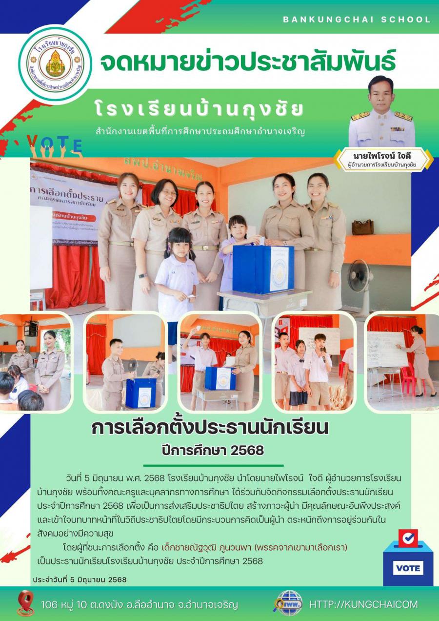 โรงเรียนบ้านกุงชัยนำโดยนายไพโรจน์ ใจดี ผู้อำนวยการโรงเรียนบ้านกุงชัย พร้อมทั้งคณะครูและบุคลากรทางการศึกษาได้ร่วมกันจัดกิจกรรมเลือกตั้งประธานนักเรียนประจำปีการศึกษา 2568 เพืื่อเป็นการส่งเสริมประชาธิปไตย สร้างภาวะผู้นำ มีคุณลักษณะอันพึงประสงค์ และเข้าใจบทบาทหน้าที่ในวิถีประชาธิปไตยโดยมีกระบวนการคิดเป็นผู้นำ ตระหนักถึงการอยู่ร่วมกันในสังคมอย่างมีความสุข