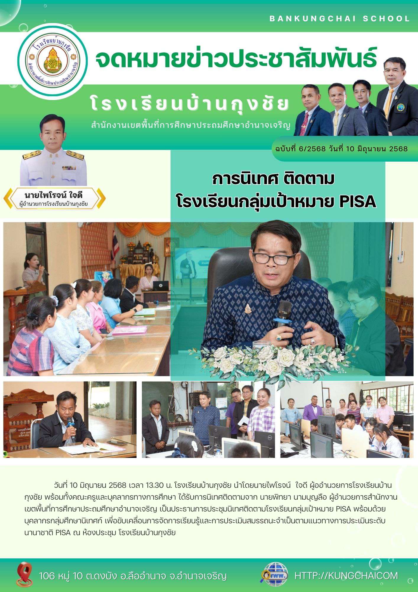โรงเรียนบ้านกุงชับนำโดยนายไพโรจน์ ใจดี ผู้อำนวยการโรงเรียนบ้านกุงชัย พร้อมทั้งคณะครูและบุคลากรทางการศึกษา ได้รับการนิเทศติดตามจาก นายพิทยา นามบุญลือ ผู้อำนวยการสำนักงานเขตพื้นที่การศึกษาประถมศึกษาอำนาจเจริญ เป็นประธานการประชุมนิเทศติดตามโรงเรียนกลุ่มเป้าหมาย PISA พร้อมด้วย บุคลากรกลุ่มศึกษานิเทศก์ เพื่อขับเคลื่อนการจัดการเรียนรู้และการประเมินสมรรถนะจำเป็นตามแนวทางการประเมินระดับนานาชาติ PISA ณ ห้องประชุม โรงเรียนบ้านกุงชัย