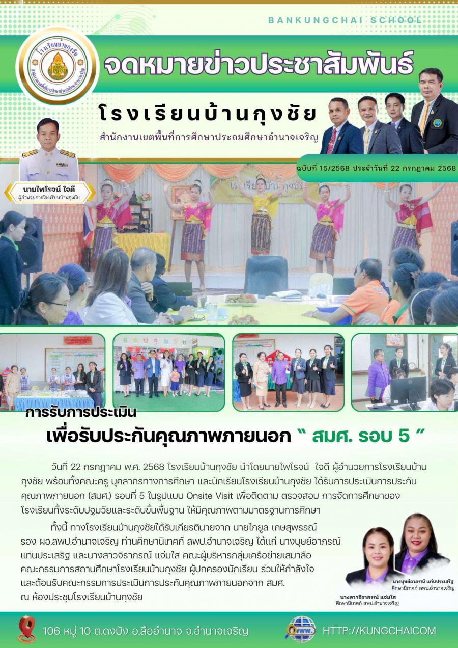 กุงชัย พร้อมทั้งคณะครู บุคลากรทางการศึกษา และนักเรียนโรงเรียนบ้านกุงชัย ได้รับการประเมินการประกันคุณภาพภายนอก (สมศ.) รอบที่ 5 ในรูปแบบ Onsite Visit เพื่อติดตาม ตรวจสอบ การจัดการศึกษาของโรงเรียนทั้งระดับปฐมวัยและระดับขั้นพื้นฐาน ให้มีคุณภาพตามมาตรฐานการศึกษา