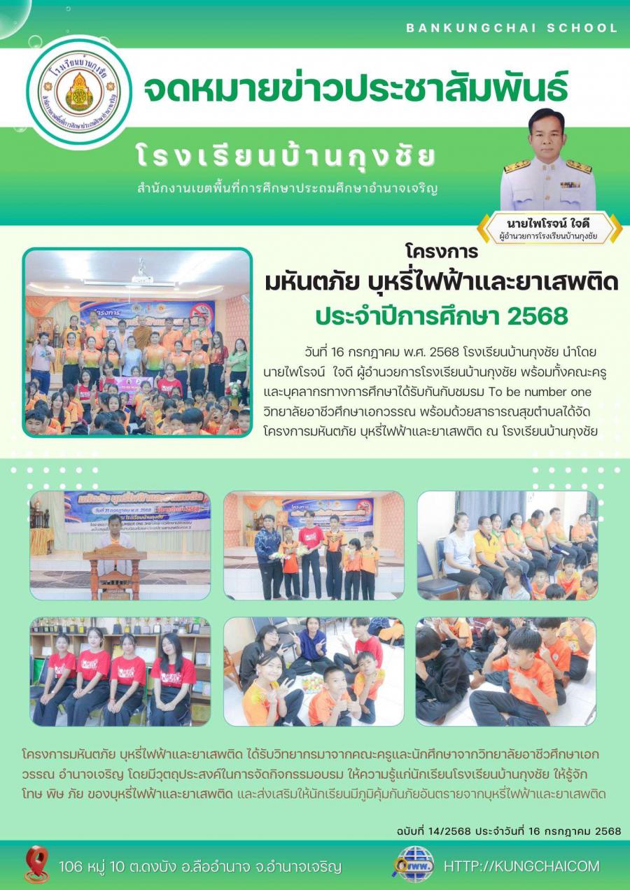 โครงการมหันตภัย บุหรี่ไฟฟ้าและยาเสพติด ได้รับวิทยากรมาจากคณะครูและนักศึกษาจากวิทยาลัยอาชีวศึกษาเอกวรรณ อำนาจเจริญ โดยมีวุตถุประสงค์ในการจัดกิจกรรมอบรม ให้ความรู้แก่นักเรียนโรงเรียนบ้านกุงชัย ให้รู้จักโทษ พิษ ภัย ของบุหรี่ไฟฟ้าและยาเสพติด และส่งเสริมให้นักเรียนมีภูมิคุ้มกันภัยอันตรายจากบุหรี่ไฟฟ้าและยาเสพติด
