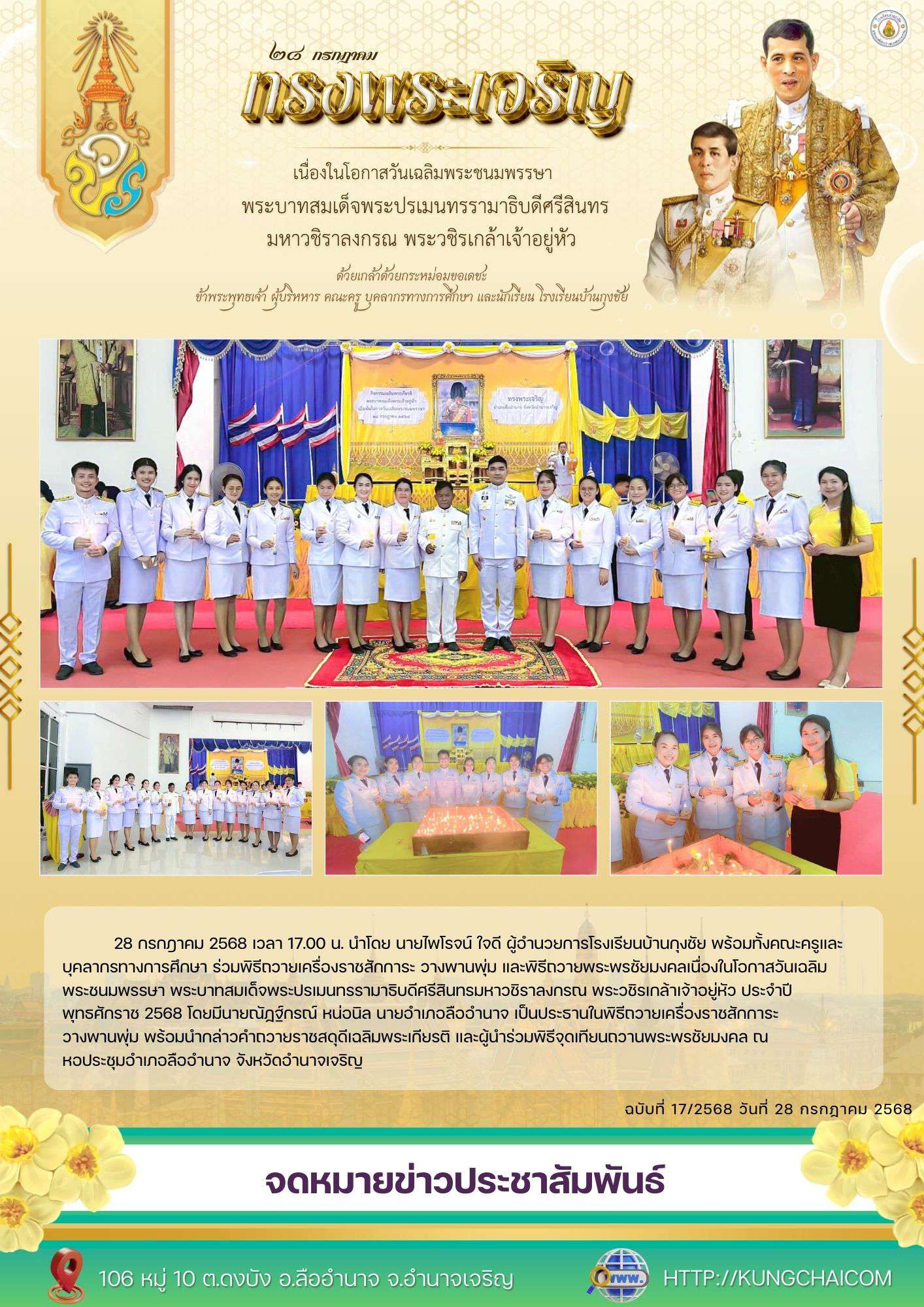 วันที่ 28 กรกฎาคม 2568 เวลา 17.00 น. นำโดย นายไพโรจน์ ใจดี ผู้อำนวยการโรงเรียนบ้านกุงชัย พร้อมทั้งคณะครูและบุคลากรทางการศึกษา ร่วมพิธีถวายเครื่องราชสักการะ วางพานพุ่ม และพิธีถวายพระพรชัยมงคลเนื่องในโอกาสวันเฉลิมพระชนมพรรษา พระบาทสมเด็จพระปรเมนทรรามาธิบดีศรีสินทรมหาวชิราลงกรณ พระวชิรเกล้าเจ้าอยู่หัว ประจำปีพุทธศักราช 2568 โดยมีนายณัฏฐ์กรณ์ หน่อนิล นายอำเภอลืออำนาจ เป็นประธานในพิธีถวายเครื่องราชสักการะ วางพานพุ่ม พร้อมนำกล่าวคำถวายราชสดุดีเฉลิมพระเกียรติ และผู้นำร่วมพิธีจุดเทียนถวานพระพรชัยมงคล ณ หอประชุมอำเภอลืออำนาจ จังหวัดอำนาจเจริญ