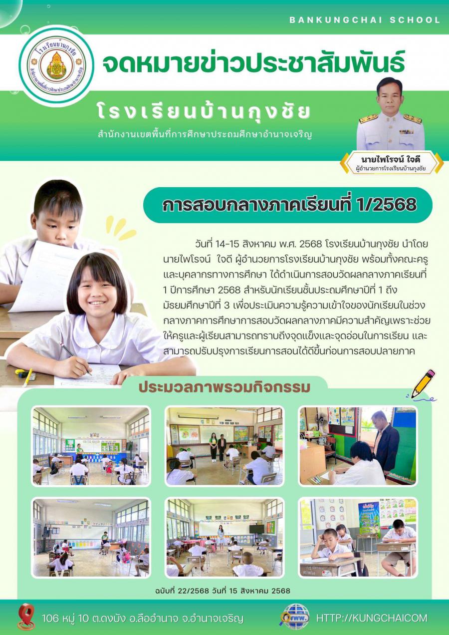 โรงเรียนบ้านกุงชัยโดยนายไพโรจน์ ใจดี ผู้อำนวยการโรงเรียนบ้านกุงชัย พร้อมทั้งคณะครูและบุคลากรทางการศึกษา ได้ดำเนินการสอบวัดผลกลางภาคเรียนที่ 1 ปีการศึกษา 2568 สำหรับนักเรียนชั้นประถมศึกษาปีที่ 1 ถึงมัธยมศึกษาปีที่ 3 เพื่อประเมินความรู้ความเข้าใจของนักเรียนในช่วงกลางภาคการศึกษาการสอบวัดผลกลางภาคมีความสำคัญเพราะช่วยให้ครูและผู้เรียนสามารถทราบถึงจุดแข็งและจุดอ่อนในการเรียน และสามารถปรับปรุงการเรียนการสอนได้ดีขึ้นก่อนการสอบปลายภาค
