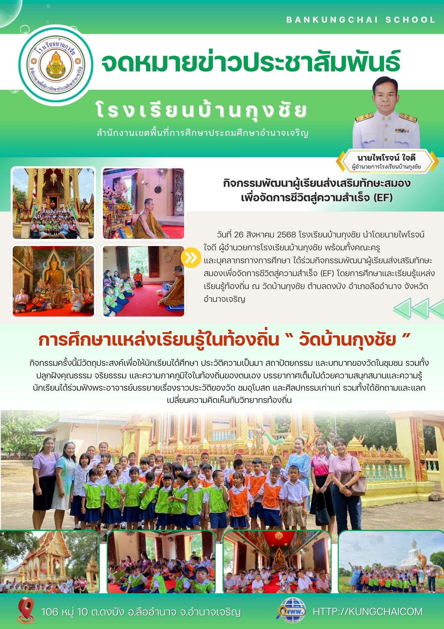 โรงเรียนบ้านกุงชัยนำโดยนายไพโรจน์ ใจดี ผู้อำนวยการโรงเรียนบ้านกุงชัย พร้อมทั้งคณะครูและบุคลากรทางการศึกษา ได้ร่วมกิจกรรมพัฒนาผู้เรียนส่งเสริมทักษะสมองเพื่อจัดการชีวิตสู่ความสำเร็จ (EF) ด้วย การศึกษาแหล่งเรียนรู้ในท้องถิ่น "วัดบ้านกุงชัย" ในการมอบความรู้ด้านความเก่าแก่และ ความเชื่อของบ้านกุงชัย ให้แก่นักเรียนโรงเรียนบ้านกุงชัย โดยมุ่งหวังให้นักเรียนเกิดความสนุกสนาน ได้เรียนรู้ข้อคิด คติธรรม และซึมซับวัฒนธรรมท้องถิ่น ซึ่งนิทานพื้นบ้านเป็นสื่อที่ช่วยปลูกฝังความรักในถิ่นกำเนิด กระตุ้นการคิดสร้างสรรค์ และเสริมสร้างความสัมพันธ์อันดีระหว่างโรงเรียนกับชุมชน อีกทั้งยังช่วยสืบสานวัฒนธรรมไทยให้คงอยู่สืบไป